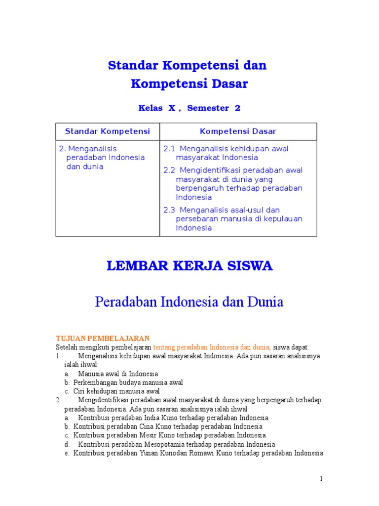 Kompetensi dasar 2.1 menganalisis kehidupan awal masyarakat indonesia indikator pencapaian Siswa mampu menyusun secara kronologis perkembangan biologis manusia indonesia. Menganalisis kehidupan awal masyarakat indonesia. Menganalisis peradaban indonesia dan dunia 2.1. Menjelaskan pembabakan zaman prasejarah berdasarkan geologi. Menganalisis kehidupan awal masyarakat indonesia. Kegiatan ekonomi di masyarakat membutuhkan tenaga kerja. Menganalisis keterkaitan kehidupan awal manusia indonesia di bidang kepercayaan, sosial, budaya, ekonomi, dan teknologi serta pengetahuannya dalam kehidupan masa kini. Menganalisis peradaban indonesia dan dunia. Secara politik, keadaan indonesia di awal kemerdekaan belum mapan, terjadi ketegangan, kekacauan dan berbagai insiden. Materi pokok masa berburu dan meramu 4. Penerapan, mind mapping, hasil belajar, sejara Sistem dalam masyarakat saling berhubungan antara satu manusia dengan manusia lainnya yang membentuk suatu kesatuan.